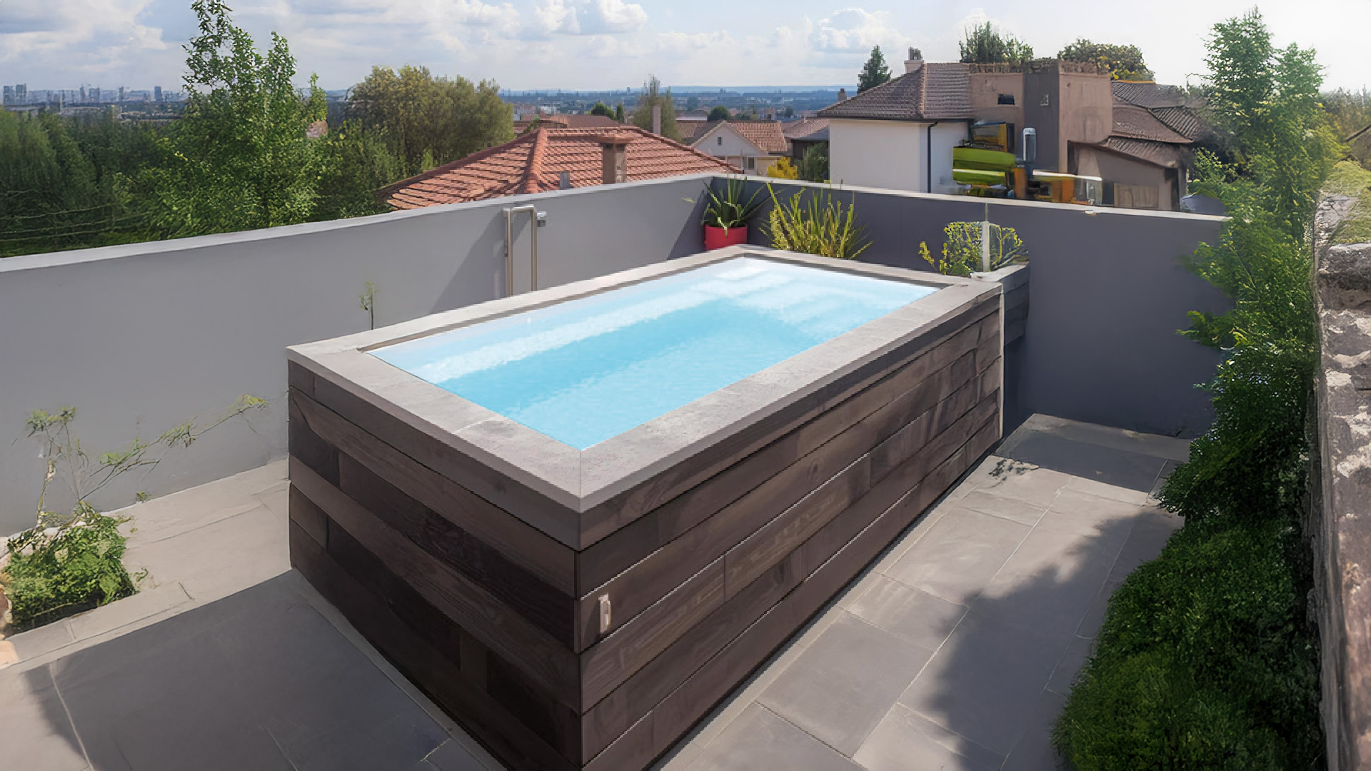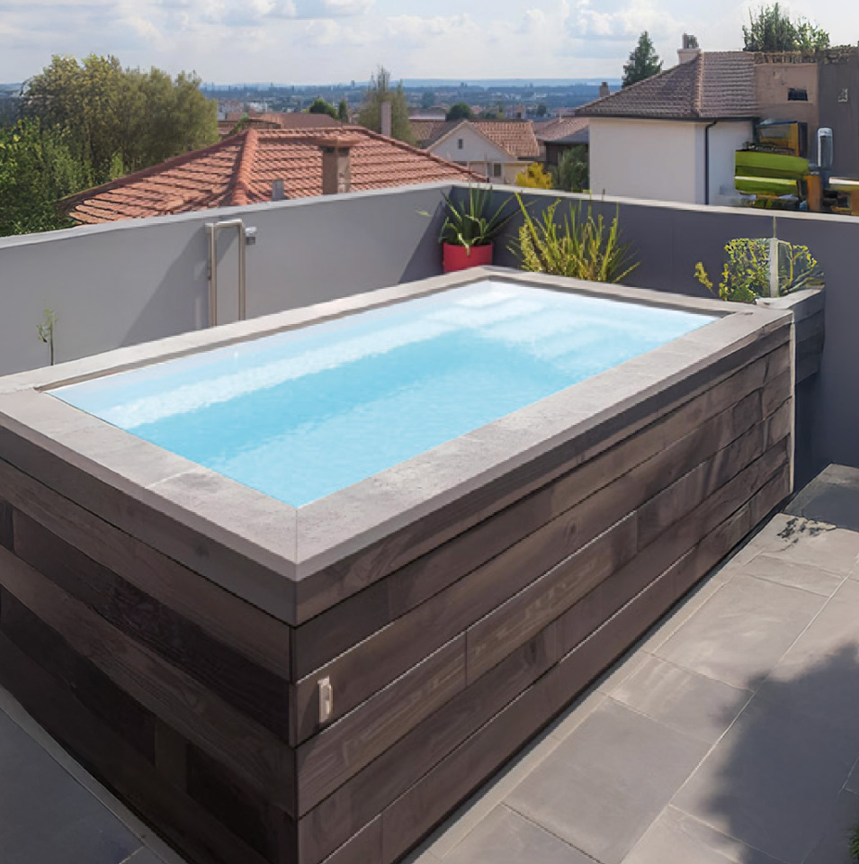 Vaso autoportante con refuerzo perimetral diseñado para instalación sobreelevada sin necesidad de enterrar.